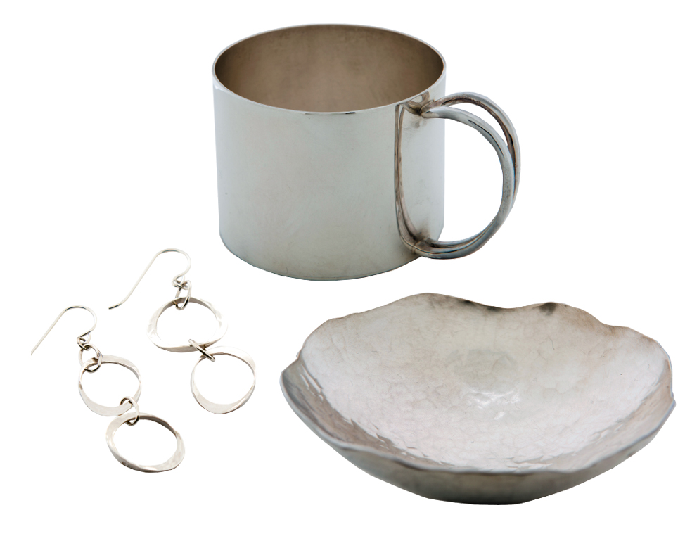 Haislip’s sterling silver “Link Earrings,“ “Flight of Fancy Baby Cup,“ and “Poppy Bowl”