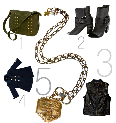 Karlie’s faux leather vest gleams with tough-as-nails hardware for an edgy take on a soldier’s ornamental epaulet. $128 at Luna
