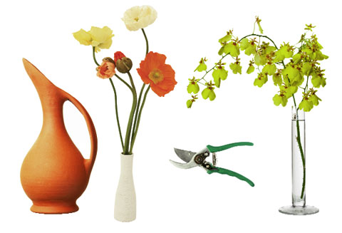 Choose the Right Container: An unusual vase can up the impact of even a simple arrangement, but choose one defined by intriguing shape or texture rather than color. “Bold hues—even a bright white—can detract from flowers’ natural beauty. For more basic containers, I prefer square vases to circular ones because they offer a nice contrast to the round, full arrangements that I love.”