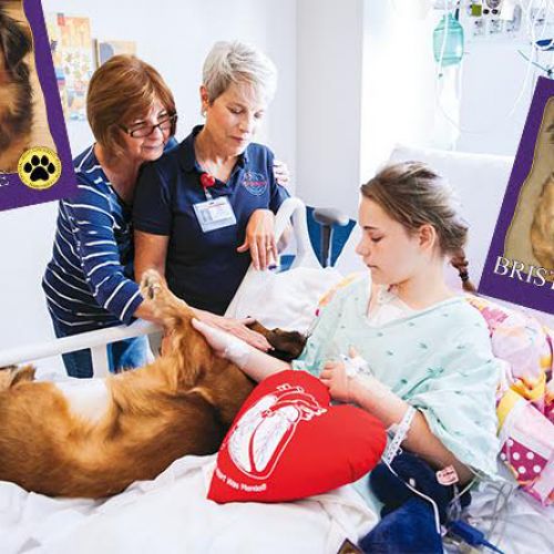 Through MUSC’s pet therapy program, pups Maddie and Bristol, with “mom” Kathy Sykes, bring happiness to hospitalized patients