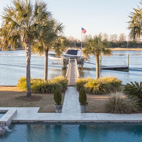 Peggy’s favorite are the muted greens and blues of the early evening, when she loves to take in spectacular sunsets from their deck overlooking a swimming pool and deep-water dock.