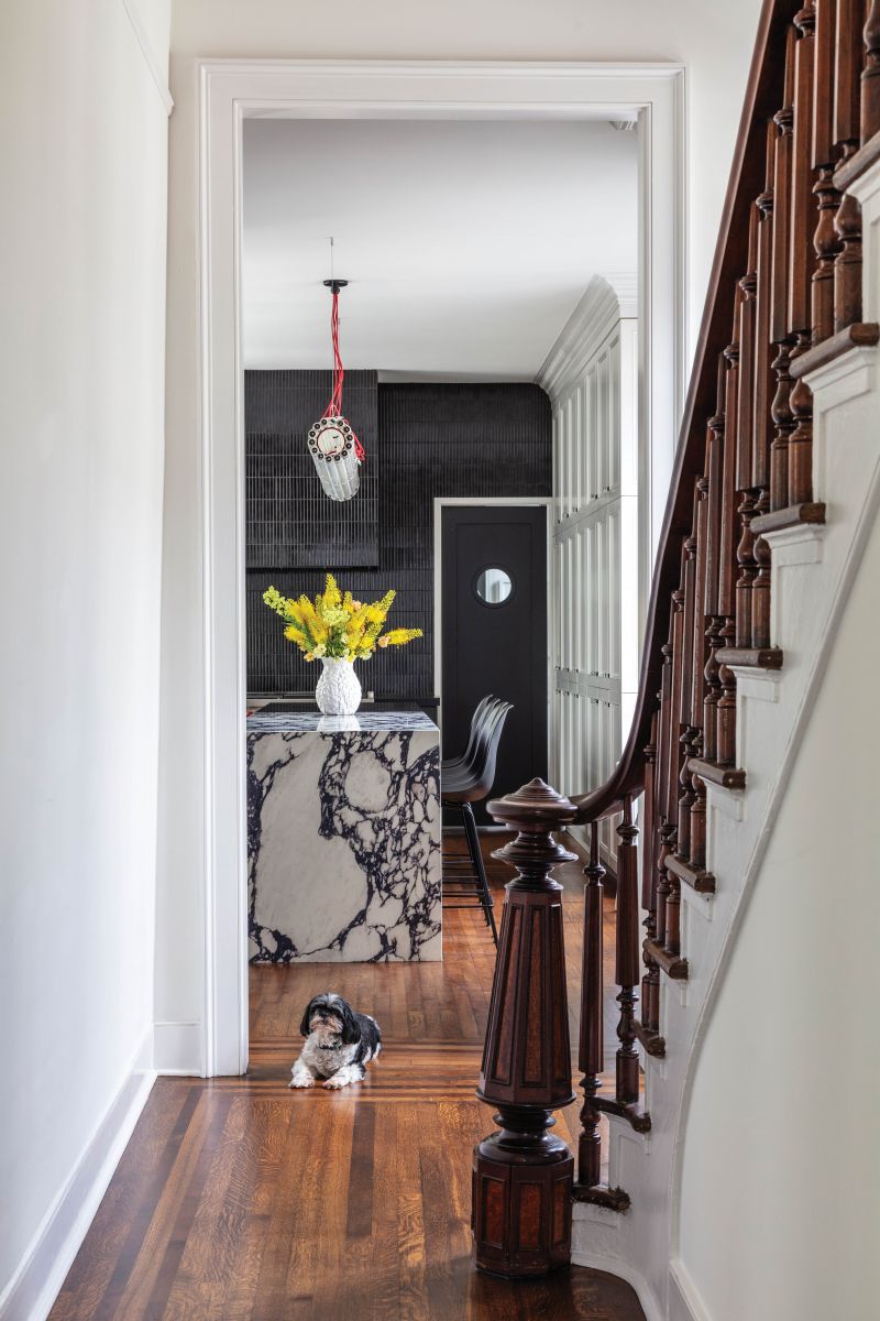 The mahogany newel post, shaped like a lighthouse, harkens to the city’s port heritage, while the front door, painted a deep Dutch black, connects visually to the kitchen beyond.