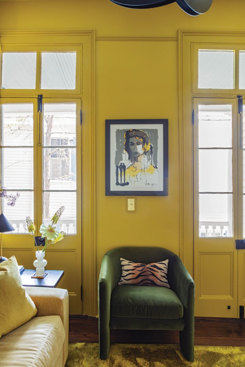 The sunny upstairs den is drenched in “Crispy Gold” by Sherwin-Williams.