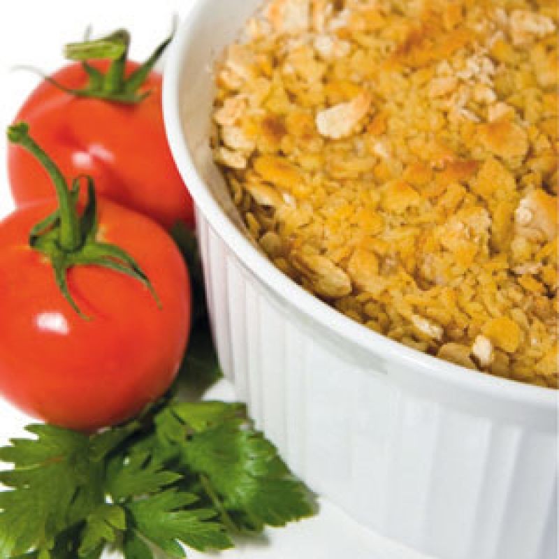 Blanch and peel the tomatoes, then quarter, seed, and chop them, reserving their juices. Put the tomatoes, reserved juices, and onion in a saucepan and heat over medium high. As soon as the mixture begins to boil, reduce the heat to a bare simmer and cook until the onions begin to soften, about five minutes. Turn off the heat. Position a rack in the center of the oven and preheat oven to 375°F. Choose a deep two-quart casserole dish that will hold all the ingredients in three layers and grease it well with butter. Put about a half cup of crumbs in the bottom of the dish, followed by a third of the shrimp and then a third of the tomatoes. Dot with butter and season well with a healthy pinch of salt, pepper, and/or mace or nutmeg. Repeat two more layers with remaining crumbs, shrimp, tomatoes, and seasonings, reserving enough crumbs to cover the top. Dot with butter and bake until nicely browned, about 20 to 30 minutes.