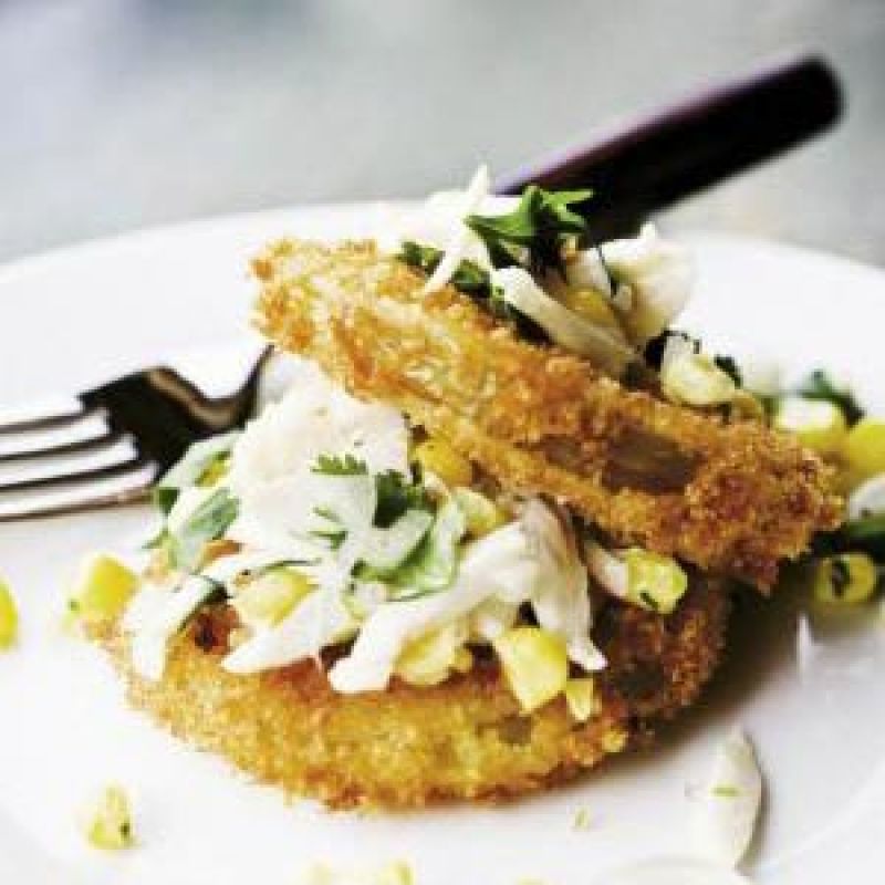 To assemble each stack, place one fried green tomato on individual serving plate. Top with a tablespoon of the crab salad. Top with another fried green tomato, followed by another spoonful of crab salad. Layer the remaining servings in the same fashion, distributing the crab salad evenly. Serve immediately.