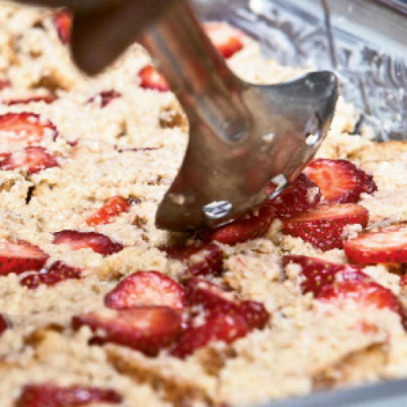 Preheat oven to 350°F. Grease a 10" X 13" baking pan with Smart Balance. Set aside. Cut bread slices into quarters and set aside. In a mixing bowl, beat eggs. Add vanilla, cinnamon, nutmeg, brown sugar, agave nectar, and milk, beating to combine. Add bread and gently stir. Gently stir in strawberries. Fold mixture into pan. Bake for 45 minutes. Serve warm.