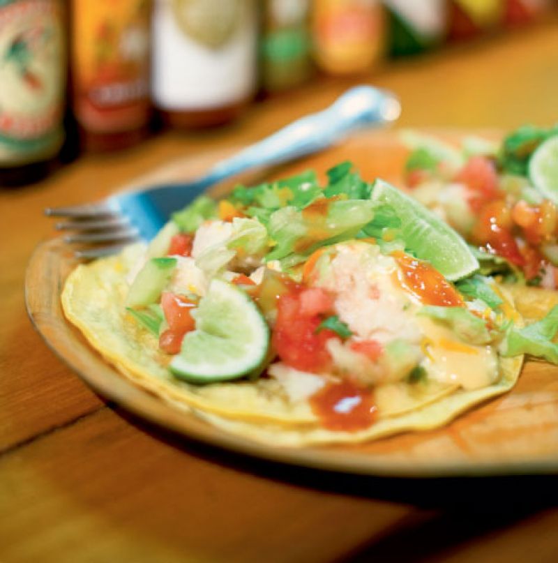 Preheat oven to 350°F. Place first three ingredients in a bowl and fold to coat. Refrigerate for 30 minutes. Heat sauté pan over medium heat. Add fish and sear for 30 seconds on each side. Dust with salt and pepper. Place sauté pan in oven for three minutes. Stack two tortillas per taco. With a slotted spoon, place fish on center of tortilla. Pour one tablespoon aioli over fish. Top with two tablespoons cheese, lettuce, and two tablespoons pico and serve.