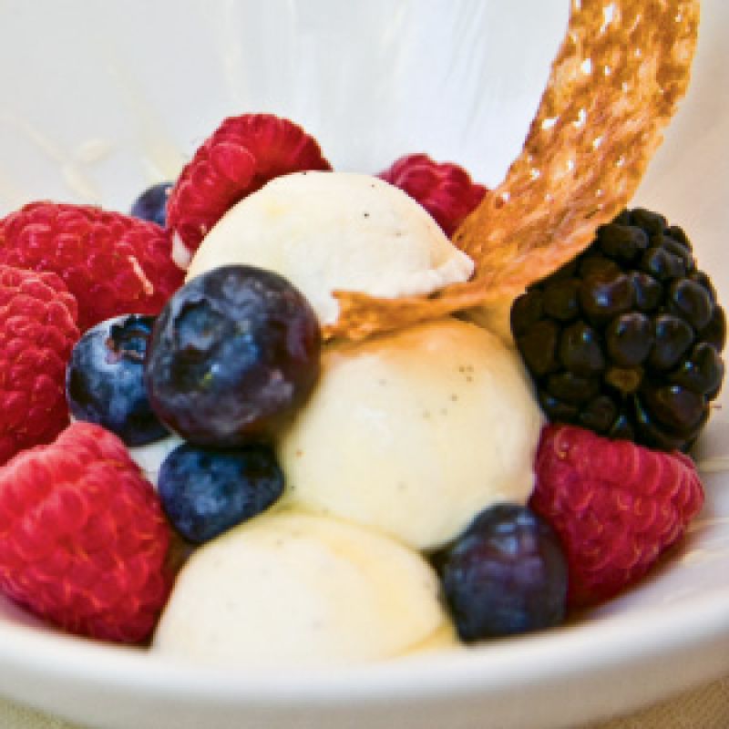 Whip heavy cream to soft peaks. Set aside in the refrigerator. Scrape the vanila bean and put the seeds in with the yolks. Using a stand mixer, whip the yolks until pale yellow. Place honey and water in a pot and cook to 240 degrees. Be careful the honey will boil up. When the honey reaches 240 degrees, turn the mixer to a medium speed and slowly drizzle the sugar into the yolks. When sugar is completely added, turn the mixer to high speed and whip until cool. Fold in whipped cream. Serve with fresh berries or pound cake, etc.