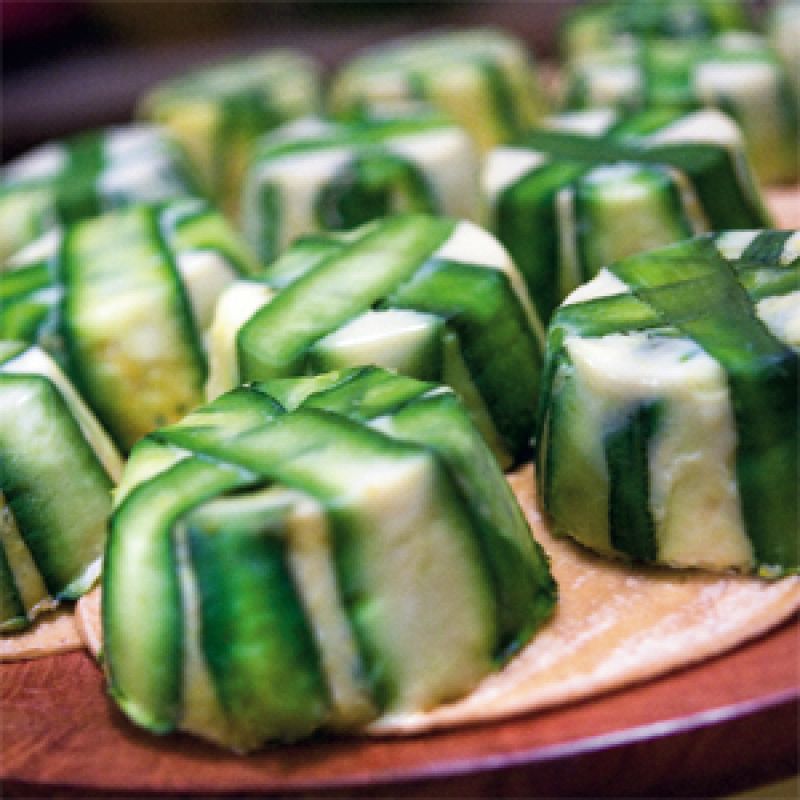 Grate two zucchini with a handheld grater. Sprinkle grated zucchini with remaining salt, toss well, and let stand for 10 minutes. Squeeze in kitchen towel to remove excess liquid, then stir into corn mixture along with red bell pepper. Grease timbales (molds) with butter. Using a mandolin, slice remaining zucchini into thin strips and lay in cross pattern to line timbales. Divide corn mixture evenly among molds.