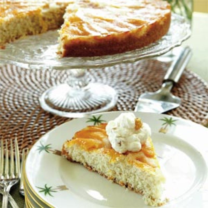 In separate bowl, sift cake flour, baking powder, salt, and spices together. Add dry ingredients to wet ingredients, alternating with cream. Spoon batter over peaches, being careful not to disturb pattern.