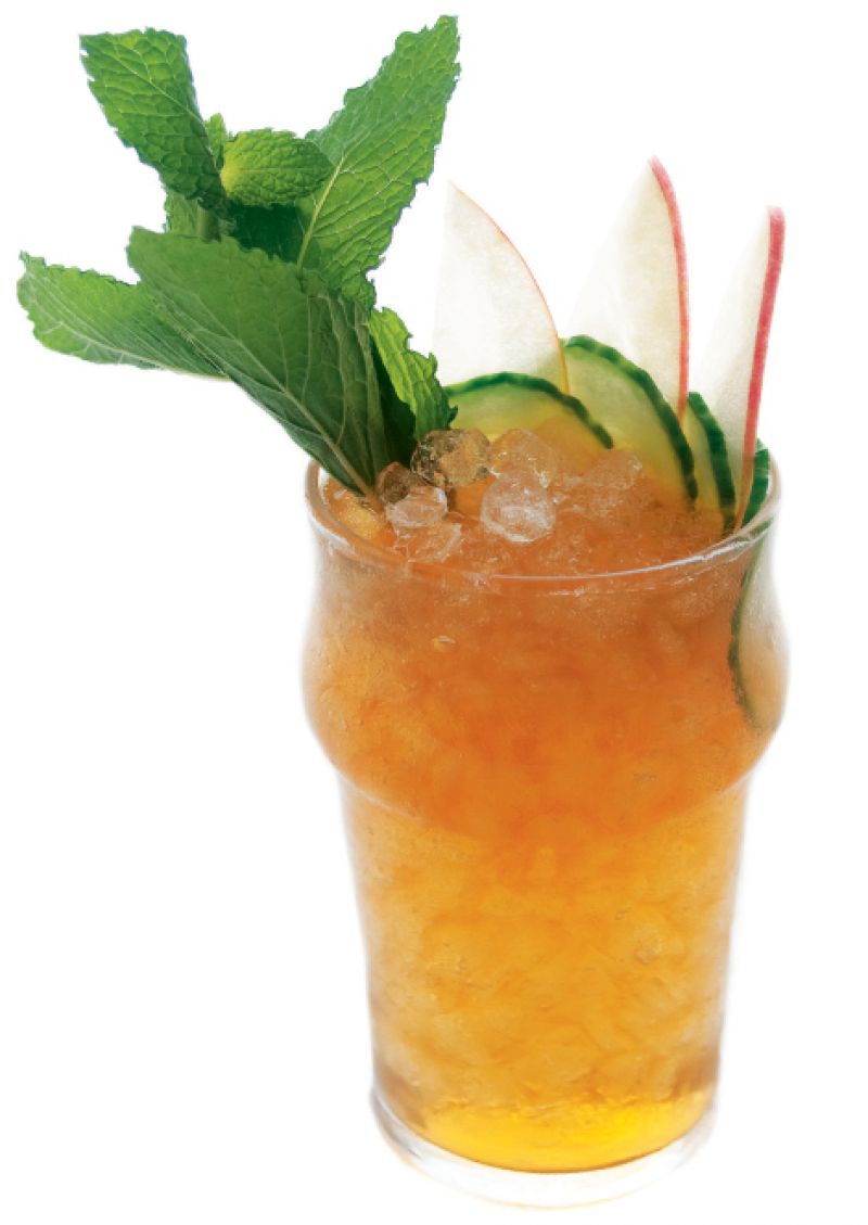 Pour Pimm’s, gin, and simple syrup in a shaker. Add lemon and cucumber and muddle. Strain into glass filled with pebble ice and top with ginger ale. Garnish with mint, apple, and cucumber.