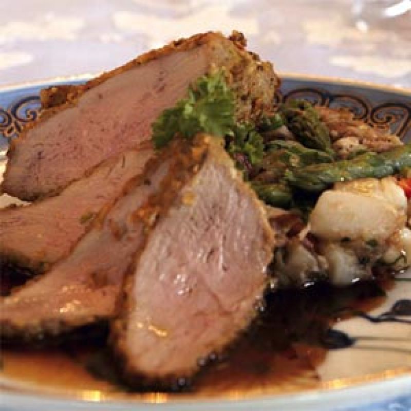 Remove duck breasts from marinade. Press into nut mixture. Refrigerate for at least two hours just before cooking.