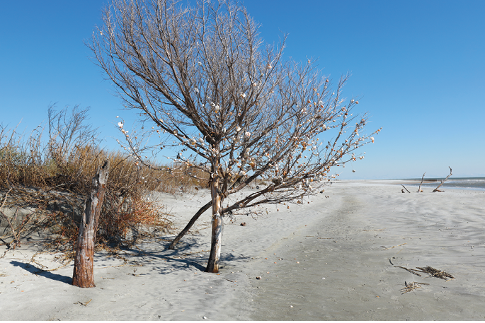 The highlight of a visit is the boneyard beach that grew significantly after Hurricane Matthew in 2016. It’s accessible via a half-mile trail that crosses the marsh and a hammock island. At high tide, the skeletons of a former forest emerge from the surf. At low tide, they’re open for exploration. Bring water and snacks for the nearly three-mile walk up the beach to Botany Island, spotting fist-sized whelk shells along the way. (Note: shell collecting is prohibited, and high ground here, a critical shorebird nesting area, likely will be roped off during nesting season.)