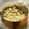 “Place the garlic clove on your cutting board and press down firmly with the flat side of a chef’s knife; after that, the peel will come off easily.”