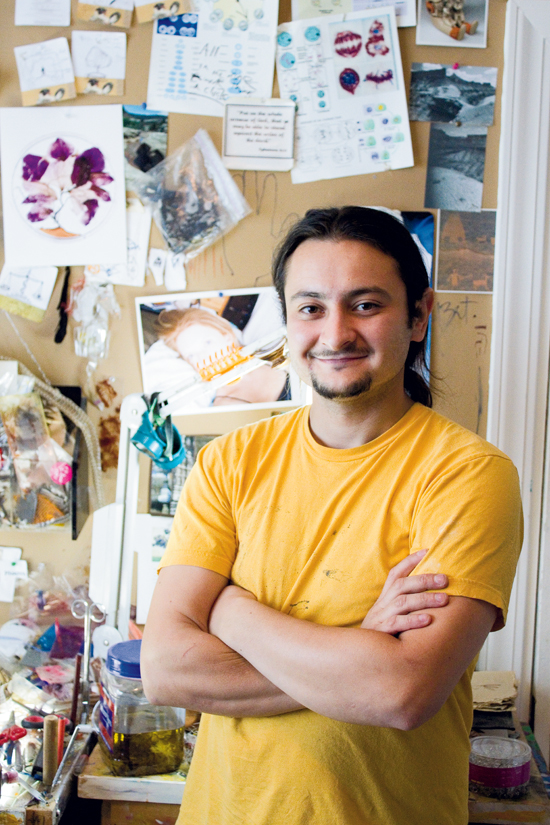Ben Timpson is a hunter of palmetto bugs, mayflies, orchids, cellophane pieces, and twigs. “I collect all over the place, from fences and sidewalks to fields, the beach, junkyards, and Salvation Army locations,” he says. “There are samples everywhere.” Armed with small containers and a bug net, this scavenger captures an array of found and organic materials, both alive and dead, before returning to his Maple Street studio and jumping into a complex creative process.