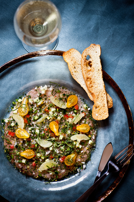 Bright with a confetti of pear tomatoes, lime supremes, lemon zest, minced shallots, and snipped chives and finished with a spritz of lime juice and truffle oil, Frank’s carpaccio of swordfish sparkles on the plate and the palate.