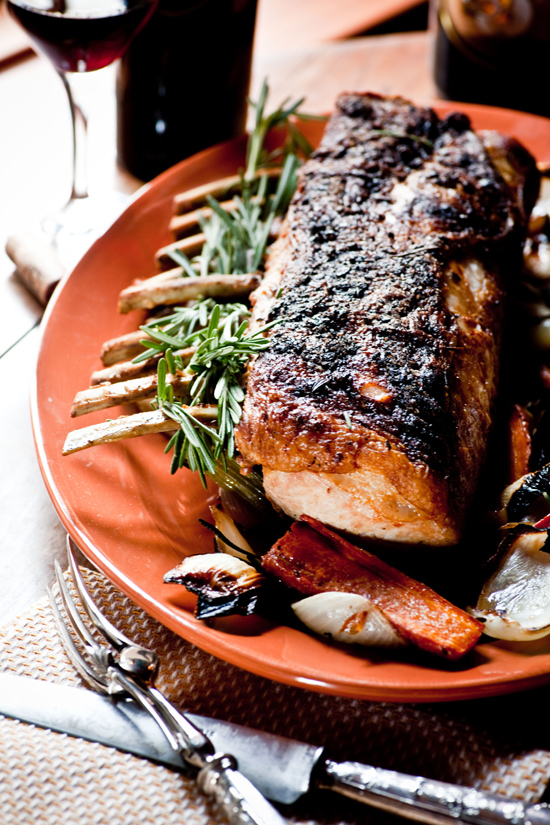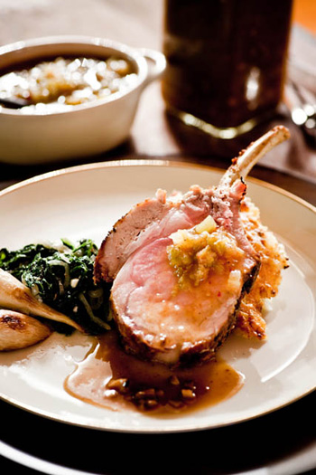 Roasted Rack of Berkshire Pork with Country Ham-Cheddar Creamed Rice, Local Turnips, & Wild Mushroom-Bourbon Beurre Fondue (Bob Carter)