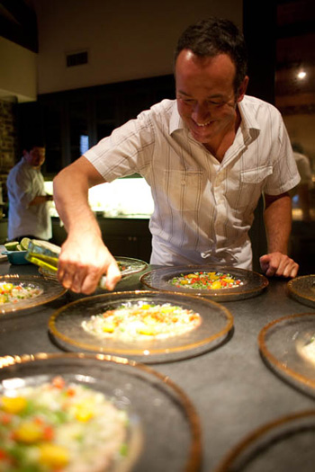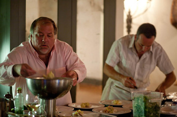 The chefs grab beers and hit the hors d’oeuvres, gathering round Frank’s heaping platters of local seafood and bragging about fishing—who caught what over the weekend. They gravitate to the local petite clams and meaty stone crab claws, true treats in this abundance. For more than an hour, they slather Bob’s rillettes on crusty grilled bread and fork pickled cherry tomatoes and foraged chanterelles, the conversation moving from food and whiskey to molecular gastronomy and boats. After a grueling week at work, they’re typical chefs unwinding—sipping suds and talking smack.