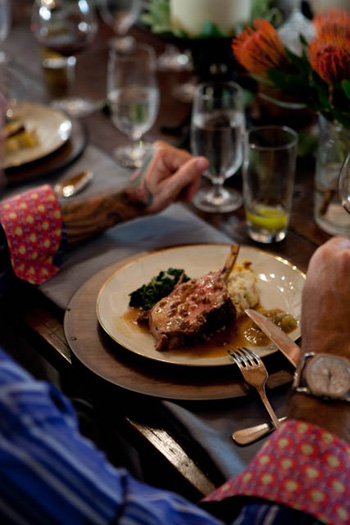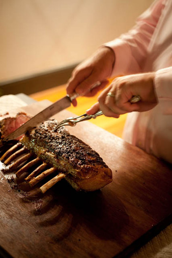 For the centerpiece of the dinner, Bob serves some of his Southern favorites. With the luxe rack of Eden Farms Berkshire pork, he dishes up perfect baby turnips from Wadmalaw Island farmer Joseph Fields, unctuous creamed Carolina Plantation rice inspired by his grandmother’s recipe, and piquant homemade tomato jam. Feeling saucy, he pours the elegant beurre fondue sauce from bourbon bottles.