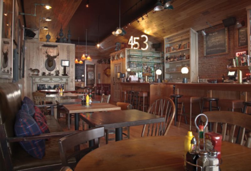 An American pub in flavor, CFB looks nothing like its predecessor. The once-dark décor was replaced with natural wood walls, tables, and chairs, while expansive front windows allow light to flood in. Bright red and chrome signs—visible even from the street—announce “CFB” and “453,” creating instant fun in an Alice in Wonderland kind of way. The bar area is frequently filled with drinkers and diners sampling from the dynamic list of craft-brewed beers, including daily flights and specials. Fine spirits and a small selection of wines are available too, but here, the starring role definitely goes to the suds.