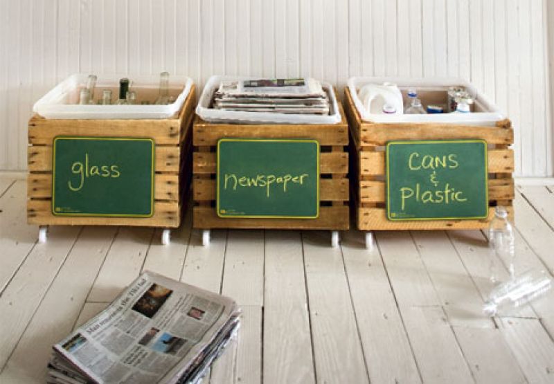 Materials: Produce crate, drill, four casters, four screws, Velcro, chalkboard, chalk, and plastic bin First: Pick up a produce crate from a local grocery store (some will give them away) or antiques market. Then: Drill four holes on the bottom of the crate, one in each corner. Use small screws to attach a caster through each hole. Finish: Cut two strips of Velcro. Adhere one side of each strip to the crate, then adhere the corresponding sides to the chalkboard. Use chalk to label each (or jot down the date of your next recycling pick-up). Insert plastic bin. For simple sorting, use Velcro to attach a chalkboard to each crate, then label with the recyclable it’s mean to corral.