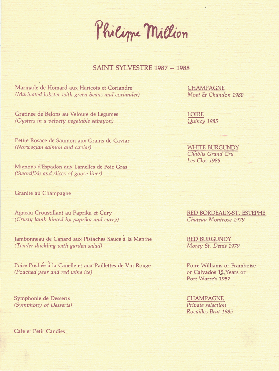 Most everything about Restaurant Million, as it came to be known, was authentically French. Its menu, the products, the Limoges porcelain, the Aubusson tapestries, even down to the tablecloths. Some guests griped about the petite portions and its formality, but the food, wine list, and service were executed with an intent that brought international acclaim. The restaurant snared a coveted Relais Gourmand distinction from Relais et Chateaux in 1985.