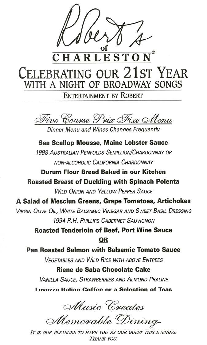 Robert’s of Charleston was a singular dining experience that attracted not only enthusiastic locals but celebrities passing through, such as TV news luminaries Walter Cronkite, Willard Scott, Jane Pauley, and Tom Brokaw. Henry Kissinger dined there; Paul Newman tried but had to be turned away from a full house.
