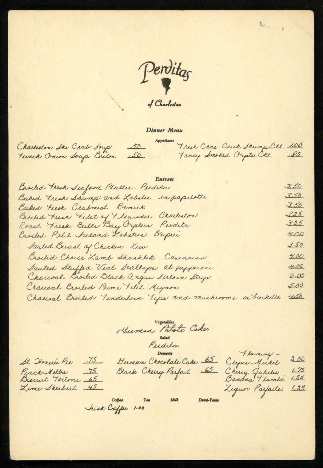 Walls in rich red brocade, the low light of candles and crystal chandeliers, a gourmet menu that could easily be found in Paris—this was Perdita’s. Opened in 1953 at 10 Exchange Street, Perdita’s was not only Charleston’s premier restaurant of the time, it was one of the finest in the country, winning the prestigious Paris Medal of Honor in 1960. Small, expensive, and elegant, it was a place held aside for special occasions, such as an anniversary or wining and dining important clients.