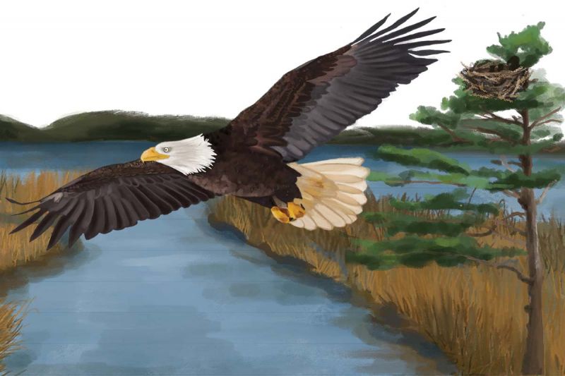 BIG BIRD The largest and most powerful bird of prey in the United States, bald eagles boast a wingspan of between five and eight feet and an average weight of about eight pounds (some weigh in at 14 pounds). Females usually are 25 percent larger than males. Because of their enormous size, their nests are the largest of any bird in North America. Erected in old-growth hardwoods near water, they measure an average of four to five feet wide and two to four feet deep. Nests are used year after year until they are destroyed by a storm or collapse from their own weight.
