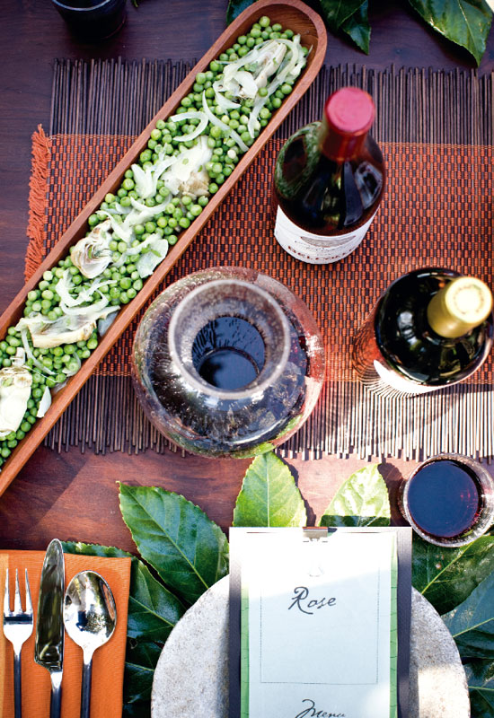 Slightly more elaborate, yet still a clever approach to the holiday, this tropical garden supper casts a vibrant nod to Mother Nature. Tropical foliage, wood, bamboo, stone, and even live goldfish conspire to effect a fresh, organic approach to Easter.