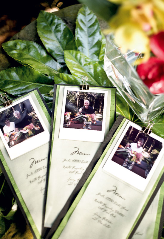 Make a lasting impression at your affair by creating menu cards that double as place cards. Select two decorative papers of slightly different dimensions to layer; then print your menu on a vellum cover, also cut to layer, leaving a 4 ¼'' x 3 ½'' space at the top to overlay a photograph. With the click of a Polaroid camera and a binder clip, the cards become personalized favors for guests to take home.