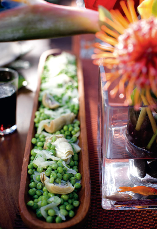 For an added and easy-to-accomplish dose of drama, treat your guests to a peek at goldfish darting about the center of the table. To make these centerpieces, root birds of paradise, anthurium, and aspidistra in river rocks and place the container inside a separate square vase; add water to both vessels, along with a few brightly hued fish in the outer container.