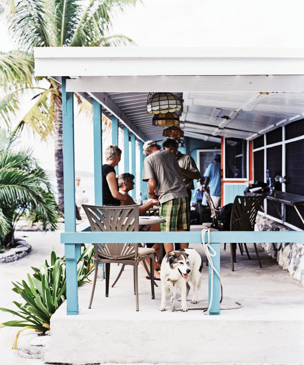 Another bright Exuma day, on another boat, we cruise over to the Staniel Cay Yacht Club, a marina and pub known for its conch fritters. After we eat our fill under rafters hung with nautical flags in every stripe and color, the proprietor, David Hocher, offers to show us a few of the club’s cottages and suites that are available for nightly and weekly rentals. Each is painted and named for a color, including key lime, periwinkle, orange, yellow, and lavender, and some of the cottages are perched directly over the water. The use of skiffs—we saw plenty of 13-foot Boston Whalers—can be included in the lodging rate, with docking just outside.
