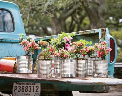 TIP: A watertight plastic grocery or zip-top freezer bag can convert nearly anything—like this metal container (above)—into a “vase.” Line the container with the bag, add water, then flowers, and conceal the bag with blooms.