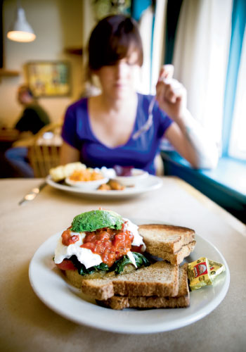 Our last destination was the Tupelo Honey Café, where executive chef Brian Sonoskus sources about 20 percent of the food from his own 12-acre farm, Sunshot Organics. The girls devoured the café’s specialty: sweet potato pancakes, light with buttermilk and laden with peach butter and spiced pecans. Marion and I were equally enthusiastic about the voluptuous “Veggie Bowl,” a mountain of tasty pinto beans, goat cheese-grits, sautéed greens, fried okra, and Sunshot salsa.