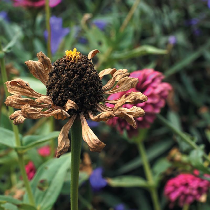 “To ‘deadhead’ is to clip or pinch off spent blooms. Gardeners do this so that plants don’t waste energy on making seeds, instead flowering more profusely and growing stronger. It also makes for a tidier appearance. Annuals such as zinnias (below), marigolds, and gomphrena, plus perennials like coneflowers and bee balm, particularly benefit from deadheading, while other plants are ‘self-cleaning’—they quickly drop their faded flowers. A similar practice is known as ‘pinching back.’ Use your thumb and forefinger to pinch off the stem of herbacious growers like coleus to encourage lateral branching and a fuller appearance.”