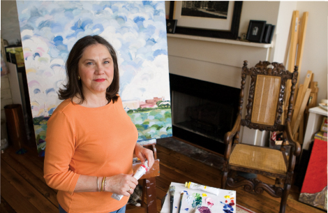 Growing up in the Lowcountry made a deep and lasting impression on Corrigan, who says she’s still inspired by changes in the landscape. “The sparkle of light on the water excites me. Nothing here is static—everything moves. Even the sky is alive.” She captures that liveliness mostly in oil now, employing vivid colors and loose brushstrokes that put her paintings somewhere between Impressionism and Expressionism. Corrigan says she draws from a variety of influences, including van Gogh and Matisse, as well as an endless stack of books that spills from the shelves lining the narrow staircase of her home.