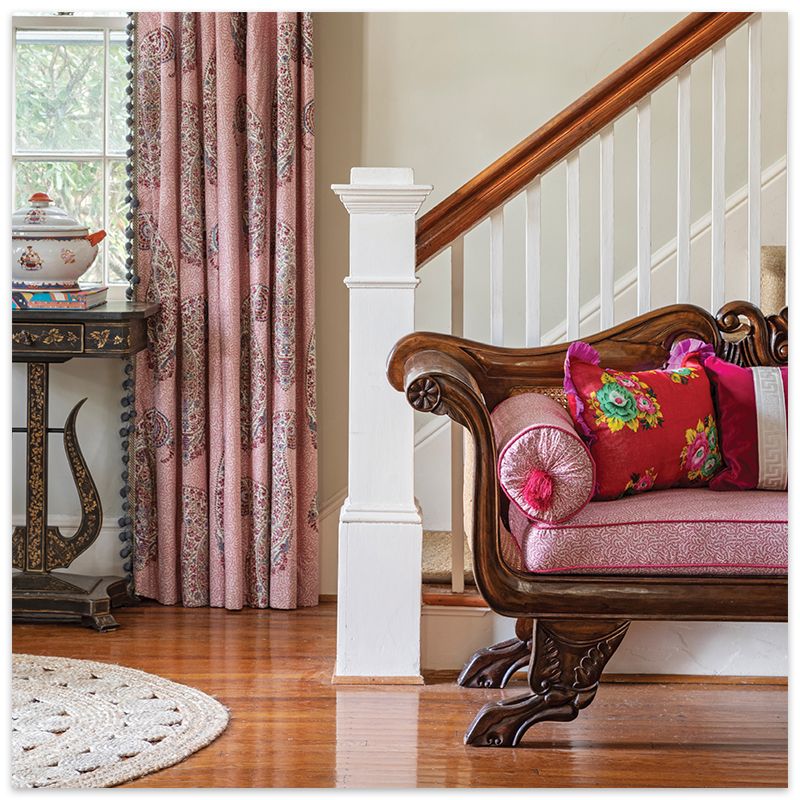 Peach-colored raw silk drapes segue into the next space, the formal sitting room, and arguably the home’s showpiece. Deep orange silk drapes provide the backdrop to a room with bold color combinations that speak to the homeowner’s originality.