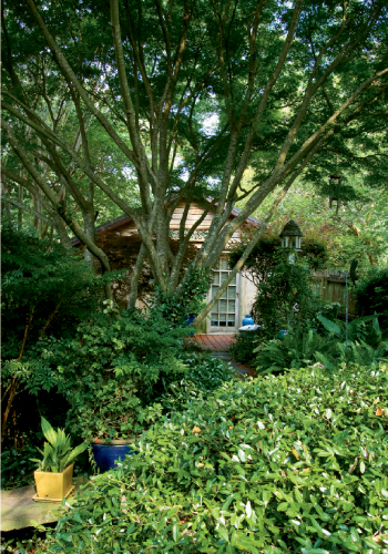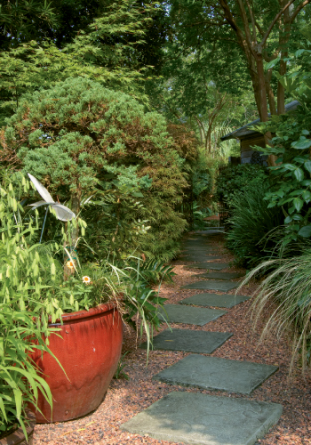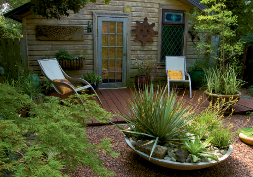 In fact, for 20-some years, she and Scott tended a significantly larger water garden—a 2,500-gallon koi pond tucked into a secluded area behind the shed. But it sprung a leak in 2008, prompting the pair to redesign the “room” with an emphasis on low maintenance. The result? A Zen-style garden featuring a “lawn” of crimson river rocks that sets the stage for a large container filled with succulents. Plantings leftover from the pond years—a Japanese maple, bamboo, and nandina (known as “heavenly bamboo” for its similar look but less-invasive nature)—enhance the Eastern feel, as do the large stones strategically placed in the rocks and the teak wall hangings that adorn the shed. “I’ve always loved Asian things, so a sort of Zen aesthetic evolved rather naturally,” explains Amelia.