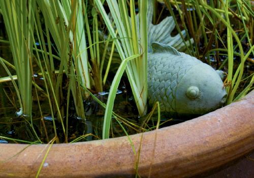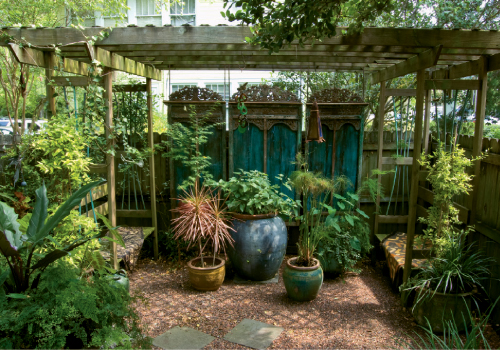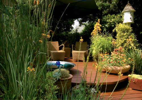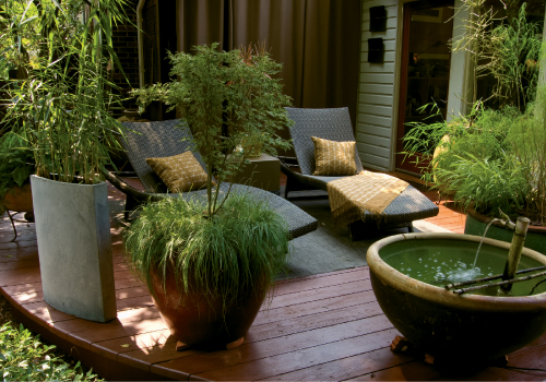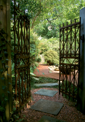 Adding to the impression that you’ve stepped into a tropical paradise are an elaborate arbor and two decks, all dressed to look like “little rooms of their own”—complete with comfortable seating, weather-resistant rugs (“for a more modern look”), bubbling fountains, and containers full of plantings that range from Amelia’s adored ‘Butterfly’ Japanese maple to succulents and small water gardens. “I love water plants. Fill a container with a really muddy dirt that holds moisture well, and they require little care but provide a lot of visual interest,” advises Amelia.