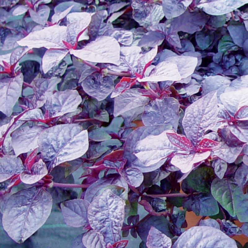 This variety of the classic summertime annual reaches 18 to 24 inches in height and gives quite a show with its deep purple leaves. Harvest it frequently to keep in scale and minimize water demands. If it becomes woody, cut back by one-third to encourage a fresh flush of growth. Basil roots well by vegetative cutting, and its leaves are excellent in sauces and with fish, lamb, and poultry.