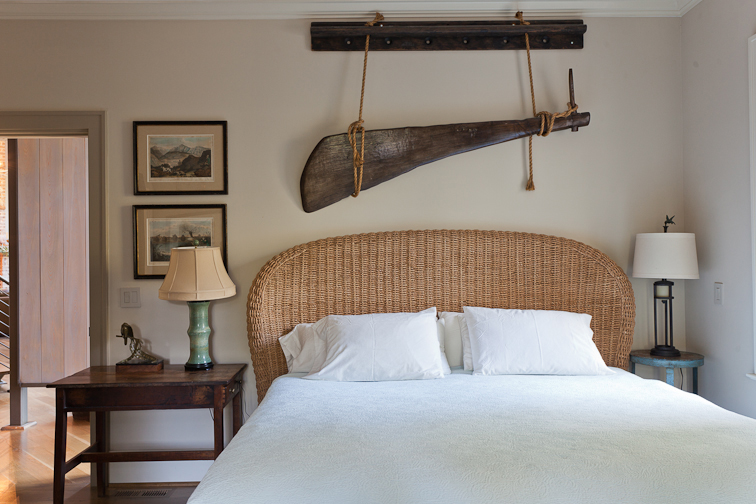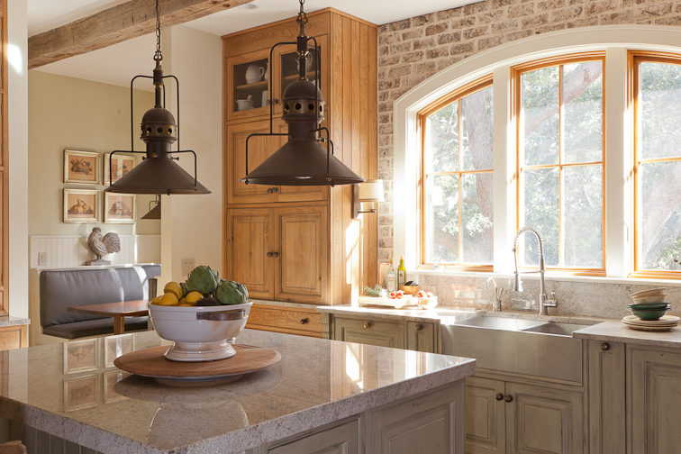 And though construction of the 4,200-square-foot home was completed in 2012, the use of salvaged materials—and new materials cleverly altered to look reclaimed—conveys a mood that’s more soulful and antique. Roughed-up telephone poles were rescued from a coal pile in Walterboro and reimagined as interior columns in the living room. Steel wall sconces that grace the same room were discovered in a second-hand shop and given a few treatments of acid to enhance their patina. And a hunk of heart pine found roadside on the Charleston Neck became a fireplace mantel in the bedroom. “I’m a collector, and it’s all about the hunt for me,” Hollingsworth says, adding that she filled six storage units with salvaged finds during the five years it took to design and build the home.