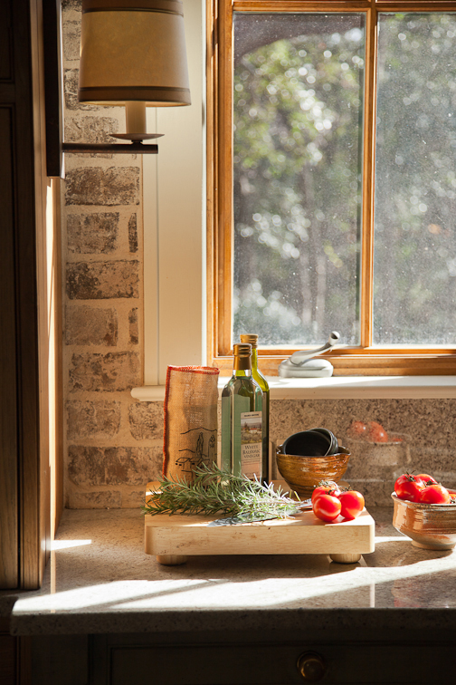 Interior designer Regina Garcia advised the couple throughout the planning and construction. “Their vision was always there,” Garcia says. “But I became part of the team, someone to collaborate with.” When it came time to design the kitchen, Garcia’s expertise was particularly useful. She encouraged the women to go with a double-entrance on the family-room side, rather than a single doorway, to maintain flow. She also advised that they eschew built-ins in favor of what she refers to as a freestanding, furniture-style kitchen. “I wanted it to look like something that had developed over time,” she explains. The farmhouse sink is flanked by armoires of Garcia’s own design, which were custom-built with oak harvested from trees that had already fallen; they look well-loved and fit right in with the rest of the house. And the copper stove hood was handcrafted by a local artisan, Randy Crosby of A&R Sheet Metal, then stained with a chemical to make it look aged. Vintage pendant lanterns and hardware made from natural bronze complete the lived-in vibe.
