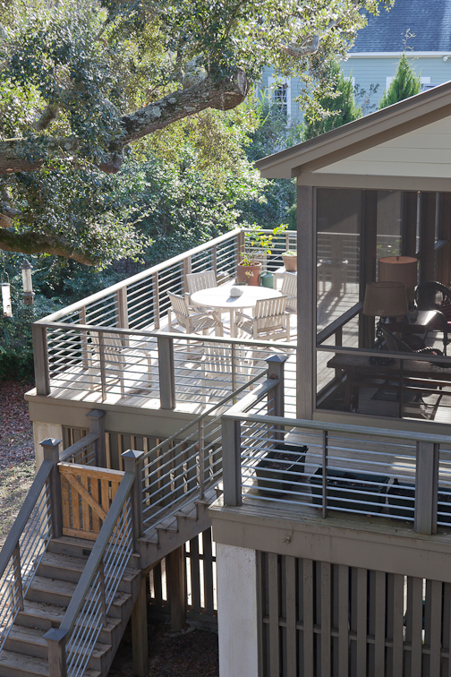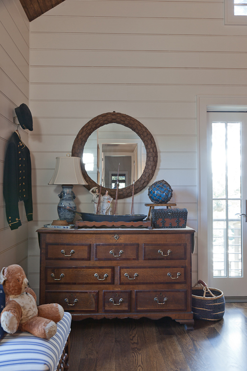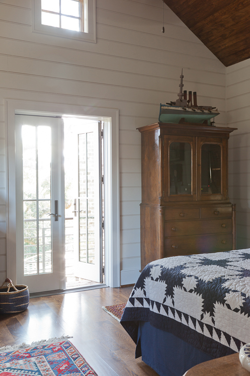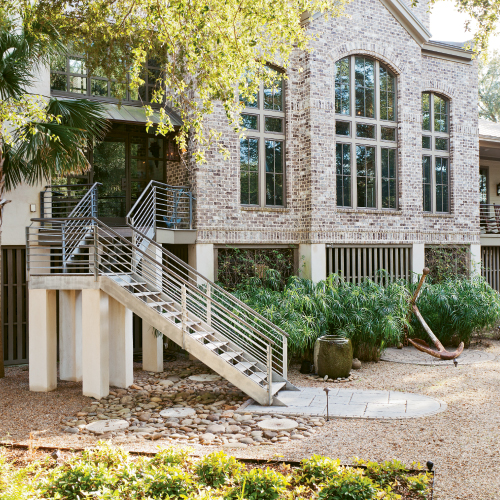 They found the perfect setting in two adjoining lots near Remley’s Point in Mount Pleasant. Though it’s only a five-minute drive from the peninsula, the wooded site feels off-the-beaten path, tucked away from main roads but just a short walk from the waterfront. “We wandered back and found this big live oak and decided that would be good to work a house around,” Hollingsworth says. Plus, the couple loved the fact that they weren’t in an established development, so they wouldn’t be subject to a stringent architectural review process. “We’re not really subdivision people, because everything we do is a little different,” Cooper says, referencing their teeny Edisto cottage.
