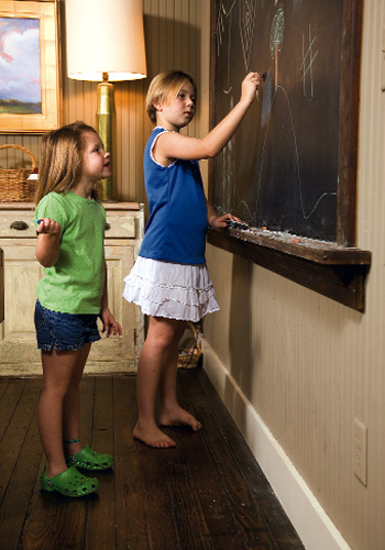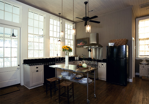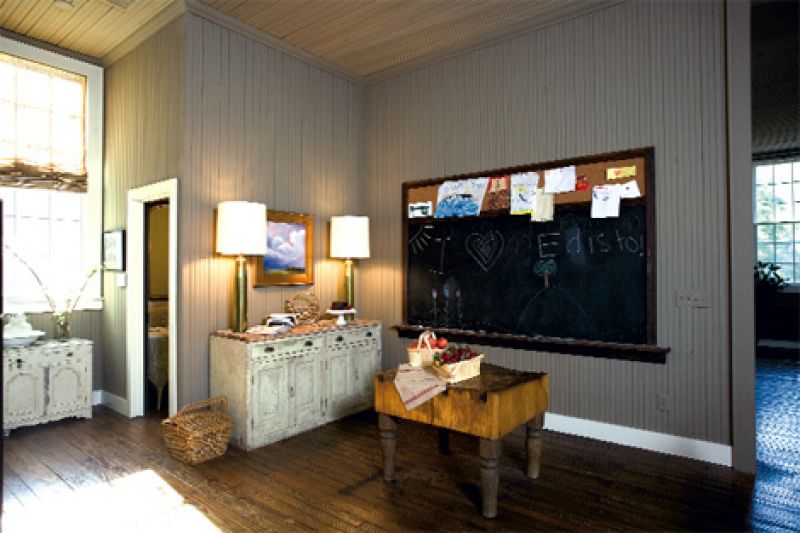 As a child, Gale Thompson spent long summers on Edisto Island. Her family’s circa-1880 plantation house, better known as “Sunnyside,” served as the clan’s quiet country retreat for as long as she can remember. So it’s no wonder that when she and her husband Bill decided it was time to build their own haven on their property at Edisto, they set out to find something historic to remake into a home. “I wanted something old,” says Gale. “It would have been hard for me to go from that old plantation house to something brand new.” She knew about an old schoolhouse constructed on the island in the 1920s—after all, she’d been in and out of it since she was a child. “It was a neat building, and the interior had a lot of integrity,” says Gale. The couple felt that the structure, used as a black schoolhouse until around the 1950s, had great bones and incredible potential—and it was conveniently just down the road on land once owned by Gale’s great-grandfather. Upon purchasing the house, the couple brought their project to Palmetto Craftsmen, Inc., a company that specializes in historic restorations. Hunter McEaddy Dawson, a cousin of Bill’s, took charge of the architectural challenges inherent in transforming a building from schoolhouse to home, and the year-and-a-half long process began. Not So Elementary… First up: moving the building from its present location to the Thompsons’ property, a stretch of land fronting Store Creek. In addition to all the considerations required to move such an old building, they also had to work closely with the Department of Transportation to ensure no old trees or other natural habitats were disturbed along Highway 174. “It’s a little bit more involved than I think most people realize,” says Bud Hay, vice president of Palmetto Craftsmen. As for the the actual transformation, “We had to take something that was nearly 100 years old and bring it up to modern building codes,” says Hay. “There was no electricity, no plumbing, no heating or air. All of that had to be added.” For Gale and Bill, one of the most important parts of the restoration was maintaining as much of the original fabric of the building as they could. All 12 windows on either side are original to the schoolhouse, along with the yellow pine floors and much of the beadboard on the walls and ceilings. When parts of the walls or ceiling had to be removed, as was the case in creating a hole for the stairs, they reused that beadboard in other areas of the home. Liveability and comfort were also key factors for the Thompsons, who have two daughters, Bel, eight, and deRosset, six. And fortunately the building had plenty of room to create a second floor, which was converted into two bedrooms and two bathrooms, along with a playroom, for the girls. They even saved some of the original chalkboard frames (the slate had long since been removed), so that each would have a drawing space over her bed. “The girls love the chalkboards,” says Gale. “They play tic tac toe, and we have fun leaving each other notes.” But Gale’s favorite additions to “the schoolhouse,” as the family now affectionately refers to it, are the porches, which stretch some 60 feet around two sides of the home. “I knew I wanted porches with French doors all the way across,” says Gale. “I wanted to bring the outdoors inside.” Scholarly Simplicity Gale brought in friend and interior designer Kimberly Glenn, owner of Kimberly Glenn Interiors, to help her achieve a clean, uncluttered look that would serve as a comfortable refuge the entire family could enjoy. “We wanted the schoolhouse to stand out, not the décor,” says Glenn. “I didn’t want to take away from the architecture of the building.” They chose a pluff mud color for the walls, accented by splashes of hydrangea blue on pillows and chairs, and used lots of chocolate browns and other earth tones in keeping with the natural theme. And rather than putting a heavy emphasis on new acquisitions, they chose a few memorable pieces, such as the old chopping block that sits near the kitchen, a carryover from Seewee Supply, a general store that Gale’s great uncle once owned, or the red trunk in the master bedroom culled from her parents’ house up the creek. For Gale and her family, the home is all about giving new life to something old and exposing a new generation to the joys she knew as a child growing up on the island. “Edisto is a part of our lives,” says Gale. “I want my girls to know the island and love it.” And what better education than from inside the walls of academia itself?