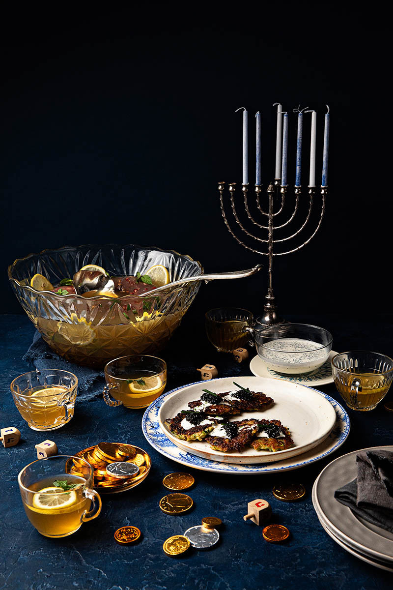 Melody and Michael Shemtov of The Daily celebrate the Festival of Lights with a tea punch sans spirits and latkes made grand with caviar and seasoned crème fraîche
