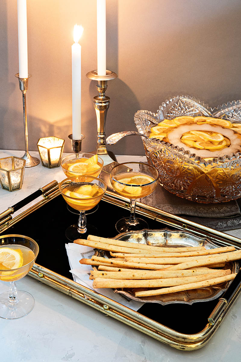 “St. Cecilia punch and cheese straws with a spicy kick are our go-to cocktail hour holiday fare. We make sure to place them front and center so they’re visible as soon as guests step in the door.”—Ted Lee