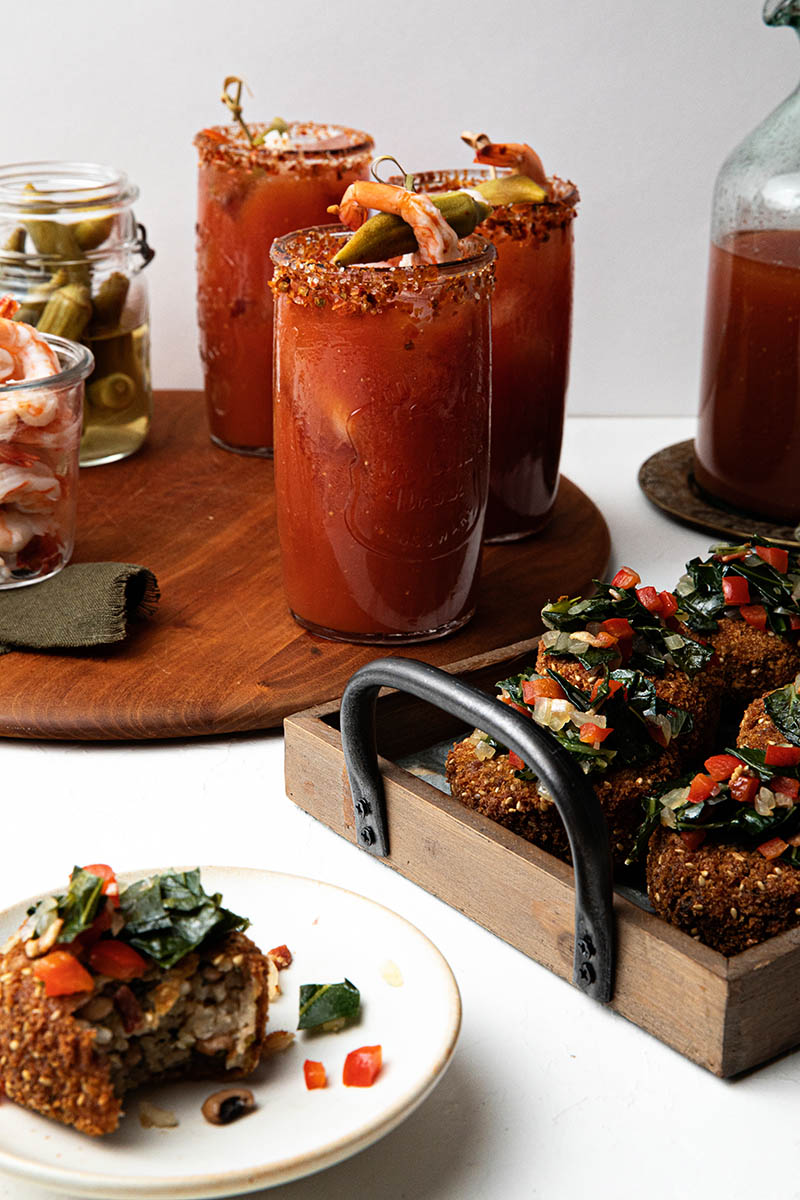 Bloody Marys & Hoppin’ John Cakes with Spicy Collards