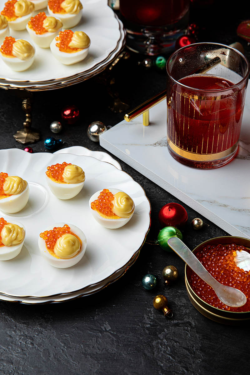Cut 1/16th inch off of the top and bottom of the eggs so when cut in half they won’t fall over. Using a very clean paring knife, cut each egg in half laterally (not lengthwise), which provides for a clean and symmetric plating. Using a spoon or piping bag, place a teaspoon-sized dot of the mayonnaise mixture on each egg, slightly off center so the yolk is still visible. Using a plastic or other nonreactive spoon, mound about a teaspoon of roe next to the mayonnaise. Arrange the eggs on a plate or platter and serve immediately.