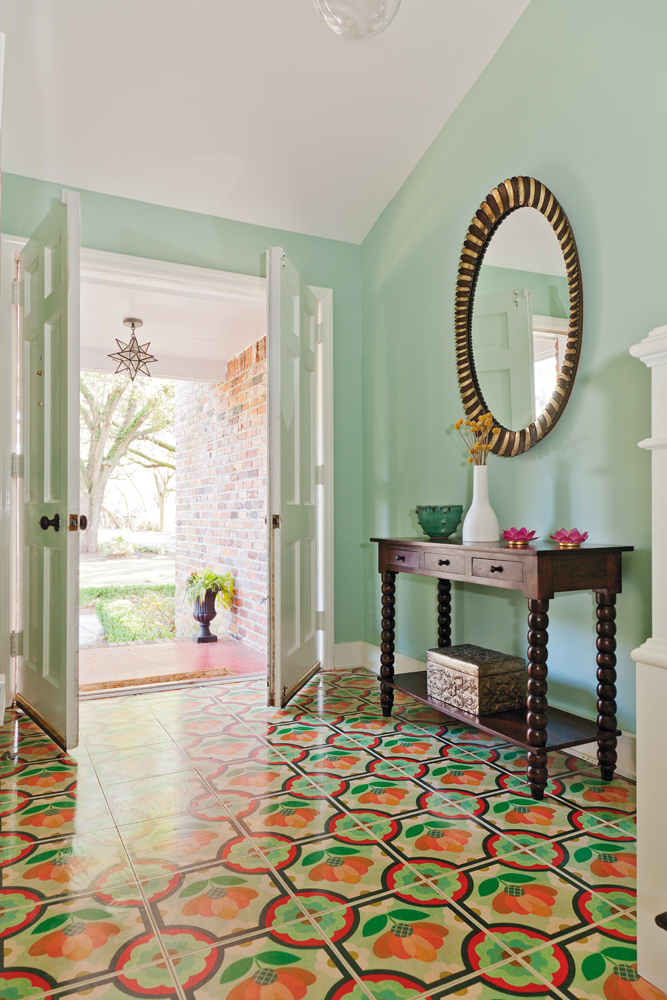 Entering the foyer of Sally Bennett’s Riverland Terrace home is like stepping into a kaleidoscope. For a whirling instant, the exotic patterns of warm reds and oranges hugged together by minty greens are so dazzling that it takes a moment to look up and meet her greeting. But Sally—the resident artist, wife, and mother of three—is unphased by any delayed response. In fact, as the creator of the captivating flooring, she’s complimented by it. “When we bought this house, I knew I wanted a foyer that would set the stage for the rest of the home. One that would make a statement,” she says.